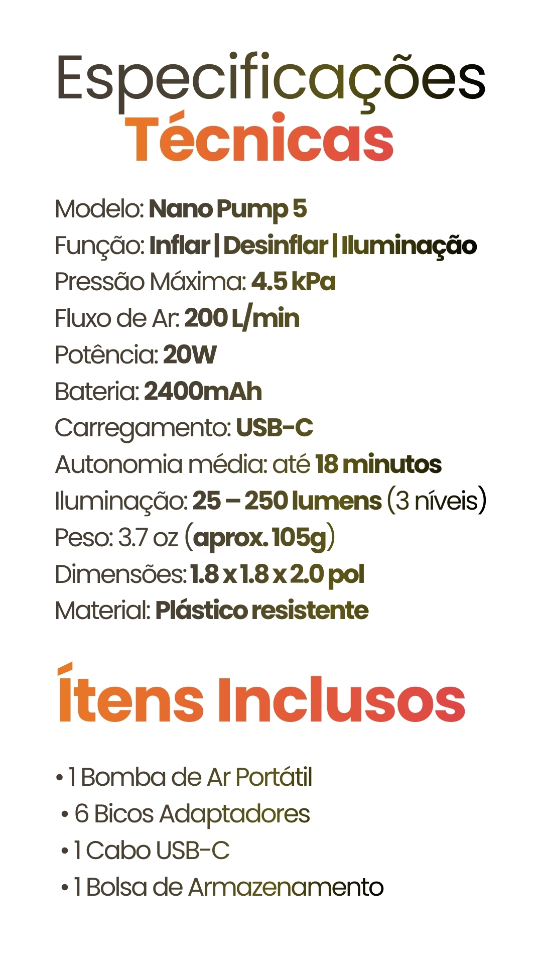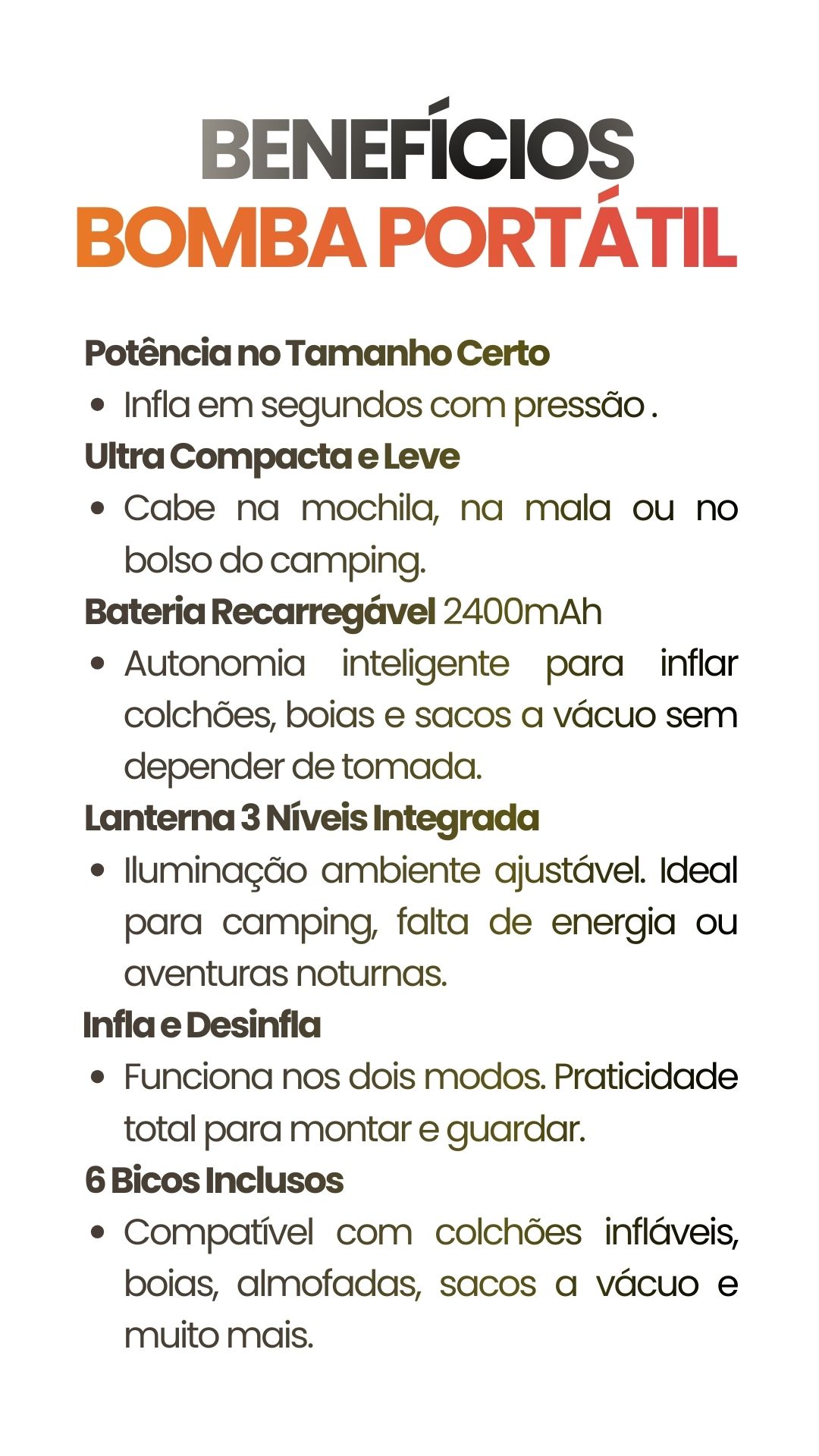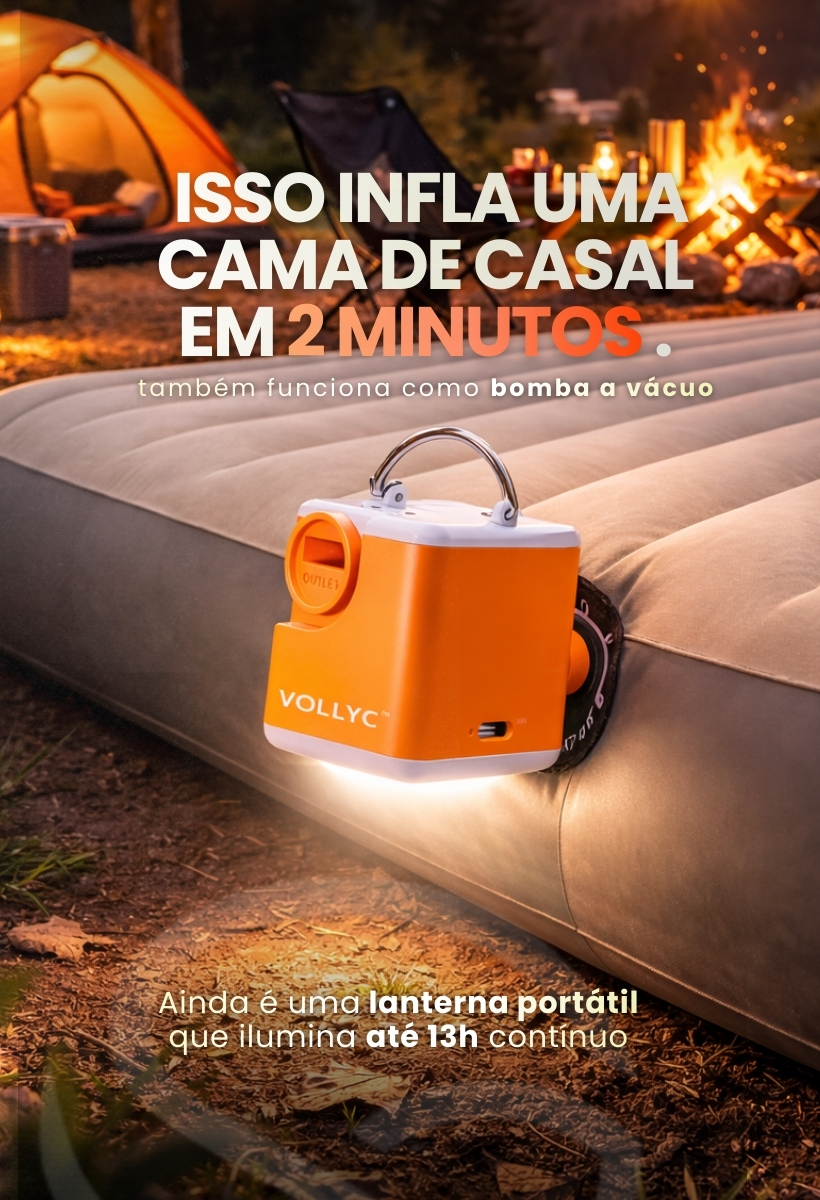 Compacta, potente e incrivelmente leve, ela infla, desinfla e ilumina com um único toque.